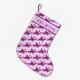 A fun animal Christmas stocking with a cartoon pattern of smiling, purple, sharks wearing Santa hats and the customizable words ‘Merry Christmas’ on a light purple background. The stocking is double-sided. Make your Christmas sharktacular with this personalized holiday stocking. The words “Merry Christmas” are customizable to your favorite phrase or a special name.