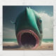 Shark sculpture on the beach, in the style of rendered in cinema4d, surrealistic grotesque, dreamlike illustration, dark cyan and green, concept art, gigantic scale, fish-eye lens