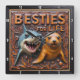 This highly dimensional square wall clock features a detailed, close-up illustration of a gray and white shark with an open, toothy mouth and a friendly, tan seal swimming together. The entire design is rendered in muted brown, tan, and dark wood tones, suggesting a deep carved relief or Engraved Wood Look, resembling sculpted marine elements. The shark is positioned on the left with a menacing grin, while the seal appears curious and friendly on the right. They are surrounded by dark, swirling seaweed and bubbles carved into the perimeter. The carving style gives the entire image a strong three-dimensional, sculpted quality. The large, three-dimensional embossed text "BESTIES FOR LIFE" is carved across the top. The clock face features a simple clock face border with large, white, numbered tick marks (1 to 12) integrated into the outer frame. The artwork is surrounded by a thick, dark brown decorative border that resembles a black wood frame.