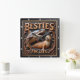 This highly dimensional square wall clock features a bold illustration of a large gray shark with an open mouth and a happy, spotted tan seal swimming together. The entire design is rendered in muted brown, gold, and dark gray tones, strongly suggesting a deep carved relief or Engraved Wood Look, resembling sculpted marine elements. The shark is positioned behind the seal, creating a playful contrast between the fearsome predator and the cheerful, smiling seal. They are framed by an elaborate wreath of swirling, dark brown vines and bubbles carved into the perimeter. The carving style gives the entire image a strong three-dimensional, sculpted quality. The large, three-dimensional embossed text "BESTIES FOR LIFE" is carved across the top and bottom in a bold, golden serif font. The clock face features a simple clock face border with large, white, numbered tick marks (1 to 12) integrated into the outer frame. The artwork is surrounded by a thick, dark brown decorative border that resembles a black wood frame.
