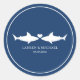 Shark wedding favor sticker in a classic navy blue background with white shark silhouette with a heart, couple's names and date.