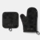 This oven mitt and potholder set features a lower stamped effect name or monogram on a mottled black background giving a look of faux suede.