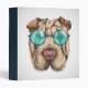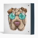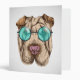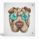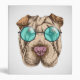 This design features a portrait of a Sharpei dog wearing teal tinted glasses.