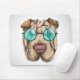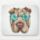 This design features a portrait of a Sharpei dog wearing teal tinted glasses.