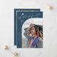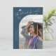 Modern and whimsical graduation announcement photo card featuring a curved photo on the front and 1 on the back. The text says "She believed she could, so she did" with hand drawn stars and a graduation cap. Add the graduate's name, information, and message to personalize this card. Navy blue background.