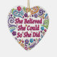 A colorful design of flowers and flourishes featuring the motivational saying, "She Believed She Could So She Did" on a heart shaped Christmas Tree Ceramic Ornament.