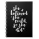 Inspirational notebook / journal displaying the phrase "She believed she could, and so she did" in white brush script with an organic ink texture to achieve an authentic, hand lettered look.