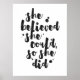 Inspirational poster displaying the phrase "She believed she could, so she did" in black brush script with an organic ink texture to achieve an authentic, hand lettered look. Designed to look great on all portrait oriented poster sizes. Please do check if the image needs to be repositioned or resized after changing the poster size.