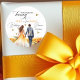 The sticker is made on wonderful paper and had no problem sticking to the bag that I purchased to put it on. I wanted to find a design that would be cute for the bride and groom and this one fit the bill as it has cute "bees" buzzing around and the wedding was taking place in a town called "Bee Cave". The packaging was great and protected the stickers. The website is easy to navigate and there are so many color choices. I had no problem finding a color that the bride was using on everything else selected. The design was adorable and there were many to choose from. You can make the figure as larger or smaller and you can place the photo and writting whereever you want to in the sticker. The printing is fabulous..better than expected.