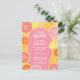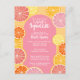 Whimsical citrus fruit in lemon, pinks, coral, orange and ruby red grapefruit colors. The hand drawn citrus slices include a watercolor painted texture for a juicy addition to a colorful wedding shower invitation.