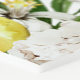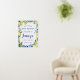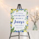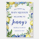 The perfect welcome sign for a lemon-themed bridal shower. Lemons nestled in white flowers and green foliage are intertwined with blue tiles to create a unique frame.