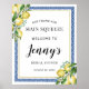 The perfect welcome sign for a lemon-themed bridal shower. Lemons nestled in white flowers and green foliage are intertwined with blue tiles to create a unique frame.
