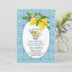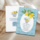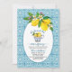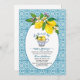 An elegant Bridal Shower design with blue tile background and a cup of lemons.