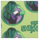 Circular badge with caricature of She-Hulk flexing in side profile.