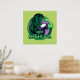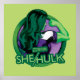 Circular badge with caricature of She-Hulk flexing in side profile.