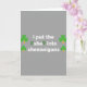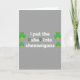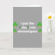 This card features a smooth grey background with the cheeky line “I put the *she* into shenanigans” centered as the main focus. Most of the words are set in bright white, while “*she*” stands out in green with matching green asterisks that nudge your eyes right to it 💚. The layout feels like a friendly wink, as if it’s meant for a partner or close friend who knows your mischievous side. Four shamrocks frame the saying, with two stacked along the left edge and two stacked along the right edge ☘️. Each shamrock is a rich emerald green with a subtle outline for shape and a small golden-yellow stem for contrast. The spacing leaves plenty of breathing room around the text, keeping the message easy to read without crowding. The white lettering stays centered and steady, while the green “*she*” and the shamrocks add the only pops of color against the grey field.
