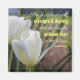Soft white and yellow tulip photograph with Proverbs 31:25, She is clothed with strength and dignity.