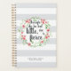 Our chic motivational planner for women and girls who run the world features the quote "though she be but little, she is fierce" in hand lettered brush script encircled by a watercolor floral wreath in pink and green on a neutral gray striped background. Personalize with the year and your name, or your choice of personalization.