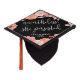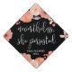 Cute grad cap topper features "nevertheless, she persisted" in white calligraphy lettering on a black background adorned with blush pink and peach flowers. Personalize with your class year.