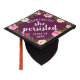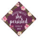 Cute grad cap topper features "nevertheless, she persisted" in white brush script lettering on a vibrant plum purple background adorned with pink watercolor flowers and green foliage. Personalize with your class year.