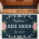 She Shed Floral Year Established Cute Navy Blue Doormat. Personalize this custom design with your own name.