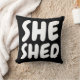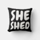 SHE SHED THROW PILLOWS. BLACK BACKGROUND. WHITE TEXT.