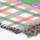 A quality printed throw has its advantages. This is a much finer weave throw than its loopier cousins, and though lighter, it is worth the investment for custom room accessorizing. The back is much prettier than the typical brown, and the fringe on the long sides very vivid, the selvage nicely done. Before photographing, I washed the throw in cold water, delicate, with a thicker woven throw the same size. On tumble dry low, this throw was dry in half the time as the other. This is a very practical quality if you use throws for furniture covers or to wrap up in frequently. The sleekness of the fabric makes it a great layer for accenting or protecting without the feeling of sitting on too much stuff. Perfect for napping or when you feel a light chill coming on. The color printing is beautiful and on this fabric, matched the design and color of my Photoshop image. This is an advantage for blending room fabrics and colors. The fringe on the short sides prints the colors from the design image and therefore varies from the side fringe. I streaked a white fractal line through the plaid pattern to give the illusion of weaving. This printed as crisp as an illusory thread, and put some white in the short side fringe, showing another advantage of print vs loomed- for artistic purposes, line lines, detail, and color integrity can be planned and preserved. My loomed throws have color limitations and more of a needlepoint texture. Print throws reproduce an exact image. The throw felt a little stiff straight out of the package, but this went away in the first delicate wash. Of course I searched the wash water for ink or bleeding and there was none.