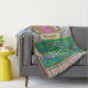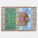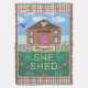 The "She Shed" is the woman's answer to the Man Cave. This original throw blanket design is for women who love to escape to their own backyard haven. It has a picture of a cute wooden shed, a white picket fence, cobblestones, a bird and a garden of flowers. The words "She Shed" have a flower pattern, too. The top and bottom are edged in a pink-and-teal plaid.