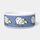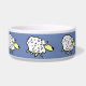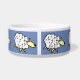 Fun sheep cartoon design repeated around this pet food bowl. Ideal for dogs, especially sheepdogs. Blue background.