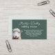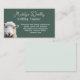 Fiber arts business card with lamb face image in the corner. Dark, forest green color with pale gray-green text. Name, or business at the top in handwritten font. A line beneath for occupation or service. All other information, such as contact, website, address, is added in paragraph form. Reverse is solid pale green.