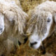 Two beautiful Cotswold sheep captured photographically in a funny and humorous moment talking to each other. Cotswold sheep originate from the Cotswolds in England and are bred for their wool and meat. They have long fleeces with an almost golden tint to it.