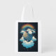 I own a lot of reusable grocery bags, but this one holds its box shape and simply stands up on its own even if there is nothing in it. Its stiffer than your regular reusable bag too, and the material is water resistant. I poured water on the exterior and it didn't penetrate inside to the other side. I'm buying a couple more. Wish I knew how durable these bags were or I would have purchased a few more with my initial order. I also like how it folds and buttons up when not in use, making it easy to put into a handbag or luggage. I haven't used this bag yet, as I purchased it for travel use, like when you're at the airport and need to small sturdy bag to place any airport purchases in, like food, souvenirs etc. I can tell you when you first see this bag, it looks very cheap, but after closer inspection of the material and the seams its a very sturdy reusable bag. I tested it out by putting some really heavy objects inside and I could not observe any stress to the bag at all. Another thing I like about it, is the fact the medium size that this is makes it easy to just carry it in your hand without the bottom of the bag scraping the ground, like most other bags do when you're short. That alone, deserves 5 stars. I just wish there were more colors to choose from! The PDX Airport Carpet printing looks just like the photo, and using this bag during travel might be a conversation piece when/if a native from Oregon happens to see it.
