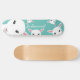 A skateboard deck with illustrated sheep on a teal background. The middle of the deck includes the words “So Baaaaad!” a sheep sound pun on the words So Bad. The words can be customized.