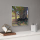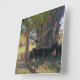 Sheep gather in the shade of the pasture trees. The original photograph was digitally transformed to resemble a painting. The sheep are mostly chocolate or deep brown. They are tightly bunched, taking advantage of the shade. The trees have striking deeply furrowed bark in tones of gray. Artwork by Diane Blackman.