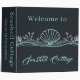 A line drawing of a scallop shell, waves, and seaweed in seafoam green, on a very dark green background on this vacation rental binder. A great way to welcome guests to your beach cottage, villa, oceanside air bnb, or holiday home with this versatile and professional binder.