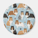 Cute Shetland Sheepdog dogs sit and stand and rollover with sable, tri-color, merle and white coats with scattered dog bones and pawprints pattern.