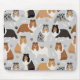 Cute Shetland Sheepdog dogs sit and stand and rollover with sable, tri-color, merle and white coats with scattered dog bones and pawprints pattern.