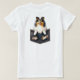 A Sheltie dog in a pocket, the cutest thing. The name of the breed is on the front of the t-shirt, however I added the image to the back with no text which makes it look like its in a pocket.