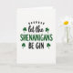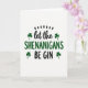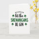 This greeting card features a bright white background with the phrase “let the SHENANIGANS BE GIN” centered as the main focus. “let the” sits near the top in black, written in a smooth, flowing style, with a small arched dashed line hovering above it like a gentle cue to follow along. “SHENANIGANS” stretches across the middle in emerald green, large and all caps, giving the message a lively St. Patrick’s Day lift 💚. Beneath it, “BE GIN” appears in black, also in all caps, landing the pun with a cheeky wink that feels like an inside joke between friends. Four green shamrocks frame the wording—two near the upper area and two closer to the lower corners—adding a lucky, flirty charm ☘️. The contrast between black and green keeps the layout easy to read while still feeling festive. The shamrocks are simple, flat green shapes placed around the text on the white field.