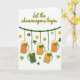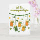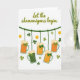 This greeting card features a St. Patrick’s Day scene on a crisp white background, with a friendly, flirty energy that feels like friends leaning in to share a joke 💚. Across the upper area, the phrase “Let the shenanigans begin” sits in olive green lettering, stretching wide and easy to spot. Beneath it, a deep emerald garland runs like a little clothesline from side to side, setting up the main display. Hanging along that line are five frothy beer mugs, some filled with warm amber liquid and others with green-tinted beer, as if a group ordered different rounds together. Each mug is tied with a small shamrock bow, a sweet detail that makes the lineup feel coordinated, like a couple or close friends dressed for the same night out ☘️. Around the mugs, three-leaf clovers float in different spots, adding motion and a light, teasing charm. Small gold coins are sprinkled between the clovers, catching the eye with yellow-gold shine against the white space. The mugs, bows, clovers, and coins are arranged in a balanced spread under the green headline, with foam tops and glass highlights clearly defined.