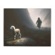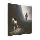 A soft glow highlights a surreal scene of a lost lamb standing on rocky ground with a shepherd following behind holding a staff