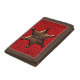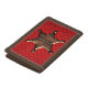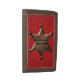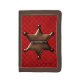 Fun brown tri fold wallet with graphics of a red on red plaid check pattern, on the front flap. Cool graphics of a bronze looking Sheriff badge decorates the checkered background. Personalize the dark brown text, on the bottom, to read what you want. Makes a great gift idea.