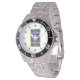 Has heft and feel of expensive stainless steel quartz watches. Good band with safety catch. I removed links, which is easy because engraved arrows show direction to push the linking pins. As always by this seller, the image (a railroad logo) is a perfect reproduction of my emailed image, and is precisely spaced and aligned.