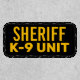Sheriff K9 Unit Patch. Black with bold gold letters and black outer edge sticking. This Sheriff K9 patch is a perfect identification patch for tactical vests, packs, harnesses and equipment so your K9 partner will be clearly identified as a law enforcement officer. See our collection for police patches and personalized id patches. COPYRIGHT © 2020 Judy Burrows, Black Dog Art - All Rights Reserved. Sheriff K9 Unit Patch