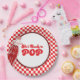 Serve up fun with these “She’s Ready to Pop” baby shower paper plates, featuring a retro soda pop bottle illustration and red checkerboard background. Perfect for a soda pop baby shower theme, these disposable baby shower plates add vintage diner charm to your celebration. Ideal for retro baby shower tableware, 1950s-inspired party supplies, and festive baby shower decorations.