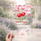 A clear, transparent background, decorated with a pink bow with cherries and pink flowers. Personalize and add a name and party details. Text: She's the Cherry on top