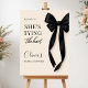 Elegant welcome sign featuring a timeless black bow design and the phrase shes tying the knot. Created to greet guests with a refined, modern look that complements black and white wedding decor. Ideal for bridal showers, engagement events, and wedding weekend celebrations. Fully customizable text with a clean, print-ready layout.