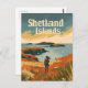 A picturesque vintage depiction of the Shetland Islands, Scotland, showcasing their rugged coastal landscapes, ancient ruins, and vibrant cultural heritage. The design features the islands' dramatic cliffs, expansive seascapes, and traditional croft houses, all rendered in a nostalgic style. This artwork captures the timeless allure and natural beauty of the Shetland Islands, inviting viewers to explore their remote charm and rich maritime history.