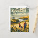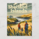 A picturesque vintage depiction of the Shetland Islands, Scotland, showcasing their rugged coastal landscapes, ancient ruins, and vibrant cultural heritage. The design features the islands' dramatic cliffs, expansive seascapes, and traditional croft houses, all rendered in a nostalgic style. This artwork captures the timeless allure and natural beauty of the Shetland Islands, inviting viewers to explore their remote charm and rich maritime history.