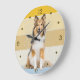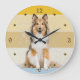 A portrait of a beautiful Shetland Sheepdog is the feature on this clock. The image is placed on a retro, slightly distressed striped sunset background. Dark gold numbers and diamond shaped markers around the perimeter make the clock easy to read. Perfect for anyone who has lost their heart to a Sheltie.